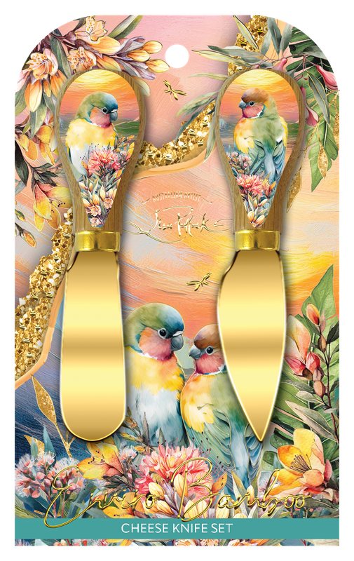 SET OF TWO CHEESE KNIVES WITH ECO FRIENDLY BAMBOO HANDLES AND STUNNING LOVE BIRD DESIGN.