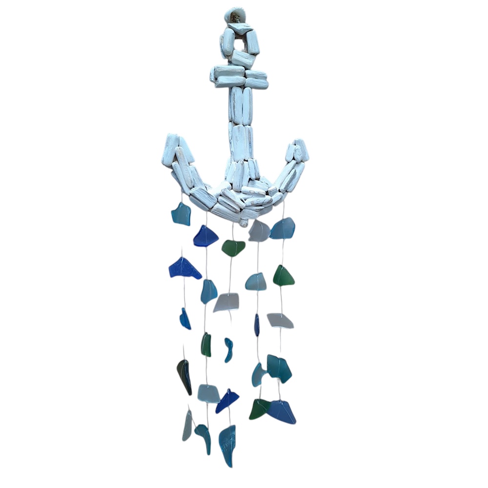 BEAUTIFUL WHITEWASHED DRIFTWOOD ANCHOR MOBILE WITH STUNNING SEAGLASS IN COOL COASTAL COLOURS. MEASURES APPROX. 40X20CM AND READY TO HANG.