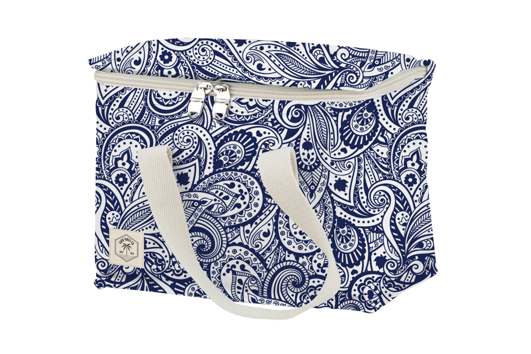 PREMIUM INSULATED LUNCH BAG MEASURING A GENEROUS 20X25X20CM AND IN A COOL BLUE TAHITIAN DESIGN.