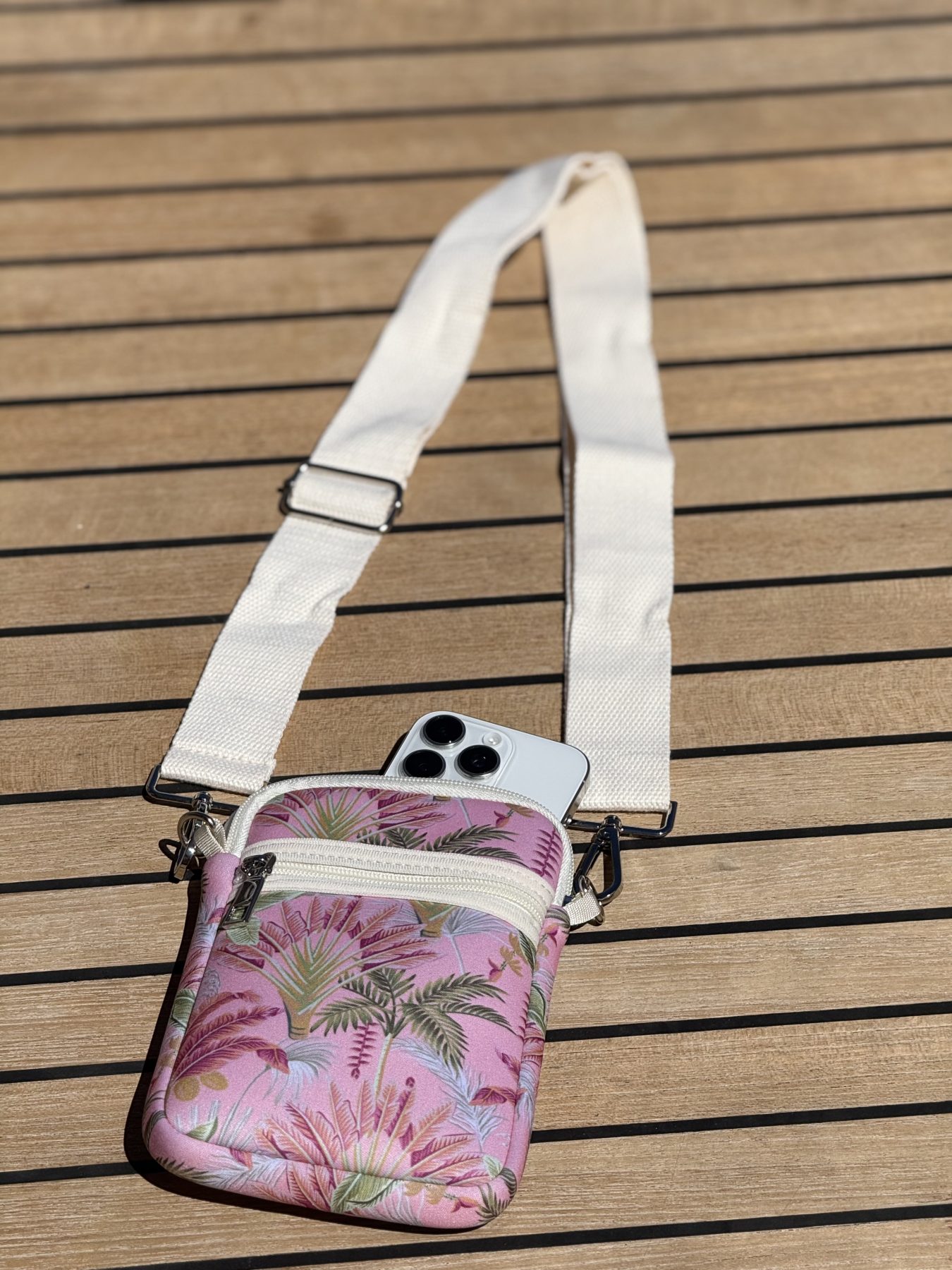 NEOPRENE TRAVEL POUCH IN COOL TROPICANA DESIGN. MEASURES 18X12CM WITH TWO ZIPPERED SECTIONS PLUS A REMOVABLE SHOULDER STRAP.