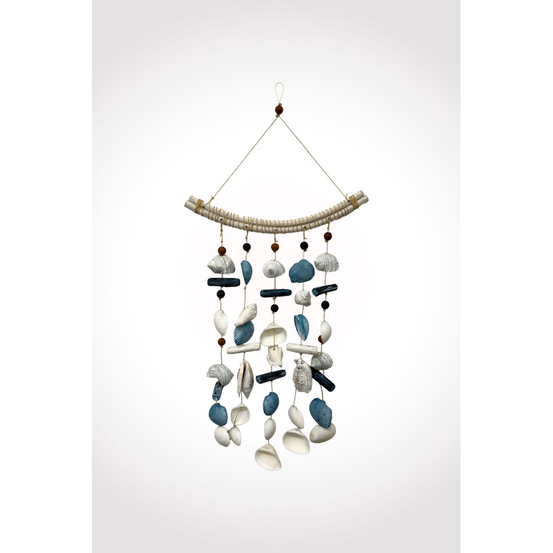 HANDMADE SEASHELL HANGER WITH SHELLS, DRIFTWOOD AND RATTAN IN COOL COASTAL COLOURS. HANGING LENGTH IS 57 X 21 CM APPROXIMATELY.