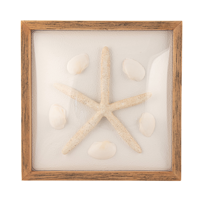 STUNNING SHELL & STARFISH RESIN WALL ART WITH TIMBER FRAME AND DOME SHAPED ACRYLIC FRONT. MEASURES 30X5X30CM.