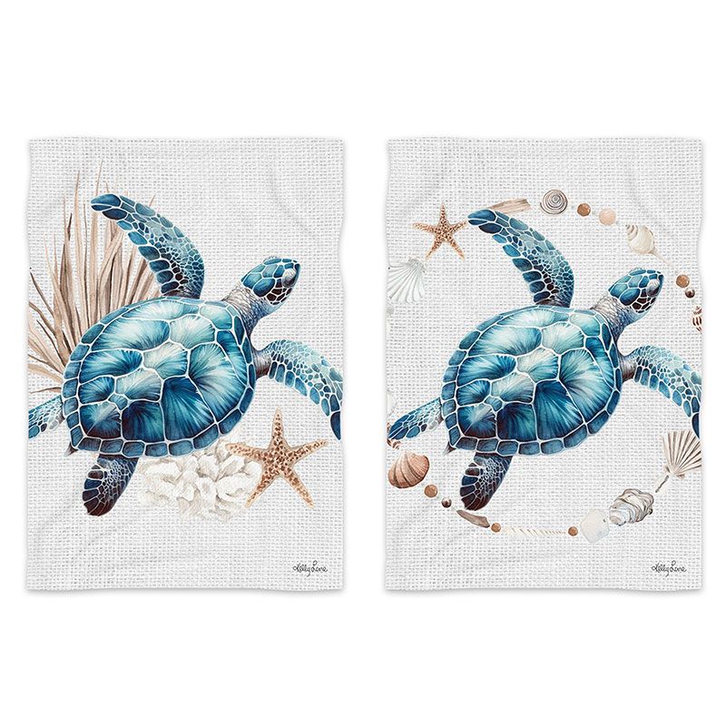 SET OF TWO SOFT FEEL TEA TOWELS WITH COOL TURTLE BEACH DESIGN IN BLUES AND WHITES. EACH TEA TOWEL MEASURES 40X60CM.