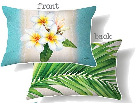 SOFT FEEL DOUBLE SIDED PRINT CUSHION WITH WHITE FRANGIPANIS AND PALMS. MEASURES 30X50CM WITH REMOVABLE COVER.